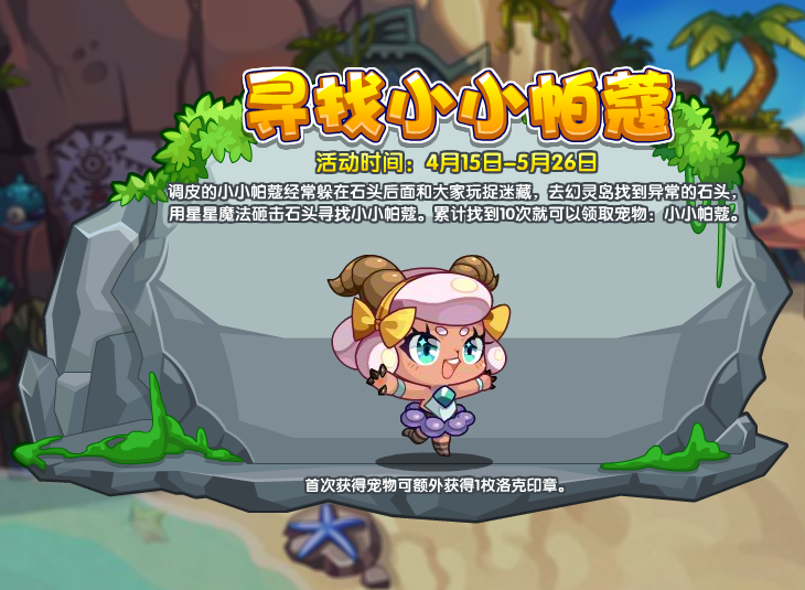 调皮的小小帕蔻经常躲在石头后面和大家玩捉迷藏,去幻灵岛找到异常的石头,用星星魔法砸击石头寻找小小帕蔻。累计找到10次就可以领取宠物:小小帕蔻。
