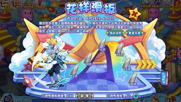 ④在完成滑板动作固定次数后可以获得滑板徽章,见界面悬浮示意。集齐60个滑板徽章即可获得宠物,集齐30个滑板贴纸即可兑换大耳狗套装啦!宠物和套装都是仅限获得/兑换1次,大家可以根据自己的时间进行规划~