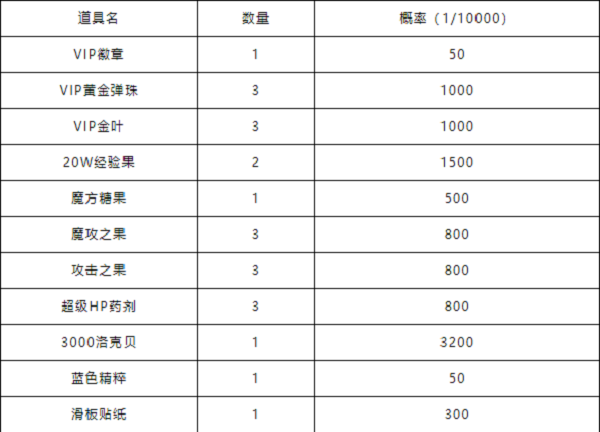 ③每次完成滑板动作可能获得的奖励内容包括:VIP徽章、VIP黄金弹珠、VIP金叶、20W经验果、魔方糖果、魔攻之果、攻击之果、超级HP药剂、洛克贝、蓝色精粹,滑板贴纸。