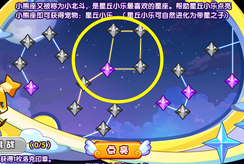 当小熊星座全部点亮(上图中黄色圆圈为小熊星座)即可领取宠物:星丘小乐。