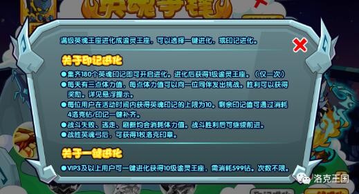 仅一次机会。无VIP等级限制。需要集齐180个印记。通过战斗,可以获得10个印记。而剩余印记需要通过4洛克钻/个获得。集齐后可以进行进化。成功进化后获得1级的谕灵王座。