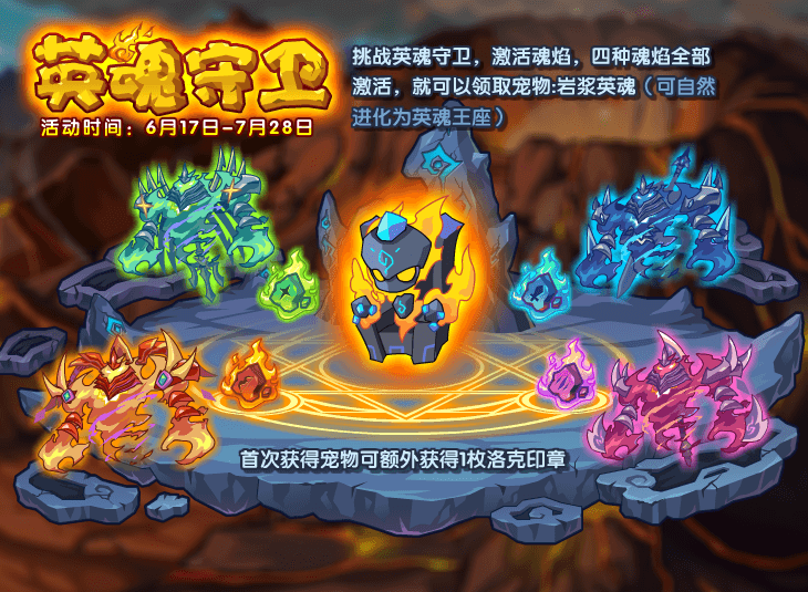 英魂王座活动原版复刻,活动机制也简单,大家挑战英魂系列的BOSS,战胜可以获得随机进度,当四个英魂进度全满则可领取宠物:岩浆英魂。每天一共有6次挑战机会。