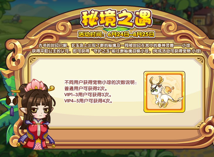 古书的封印已解,玄玉岛上出现了新的秘境及一同被封印在其中的奉神灵兽——小琮,获得平阳公主的认可,即可获得“守护之玉”前往新秘境召唤小琮。(完成活动可获得宠物:小琮)