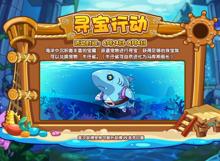 海洋中沉积着丰富的宝藏,派遣宠物进行寻宝,获得足够的珠宝就可以兑换宠物:牛仔鲨。
