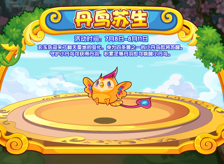 玄玉岛迎来翻天覆地的变化,身为四圣兽之一的小丹鸟即将苏醒。守护小丹鸟可获得丹羽,积累足够丹羽即可唤醒小丹鸟。