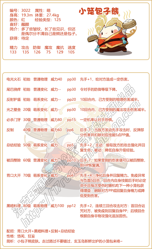 洛克王国游戏中小笼包子熊即将上线,这个宠物怎么样,厉害吗?今天易采游戏网小编珞珞就给大家带来了《洛克王国》小笼包子熊技能表图鉴介绍,感兴趣的速来围观吧!