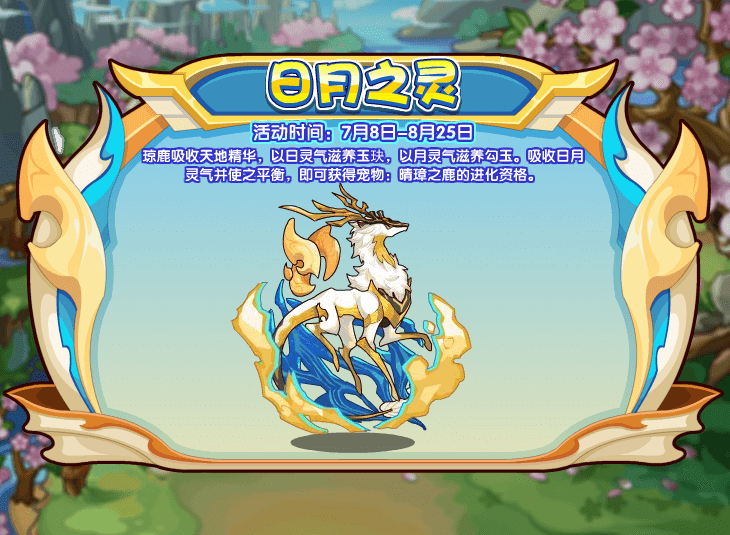 琼鹿吸收天地精华,以日灵气滋养玉玦,以月灵气滋养勾玉。吸收日月灵气并使之平衡,即可获得宠物:晴璋之鹿的进化机会。