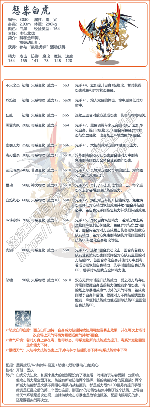 3、简析:白虎分支进化。和原来最大的差别是没有了吸血盾,消耗流玩法会受到一定影响,但攻击能力是全面开花。防控有新老防控两个选择,新的功能多老的更直接;两个新威力技能都是火系不用担心毒系内战被抵抗,都是威力写作100但另有提升手段;虎刹是狂乱之后的第二个固伤连招,删回pp的功能也被集中到了这个技能。上场自带天气环境是首次出现,血脉持续攻击必暴也是为输出服务。配招肉眼可见的多,还是要看实战再决定。