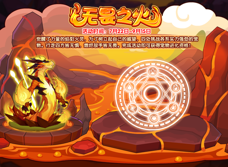 觉醒了力量的焰阳火灵,为了树立起自己的威望,四处挑战各系实力强劲的宠物。行走四方皆无惧,燃烬敌手皆无畏。完成活动即可获得宠物进化资格!