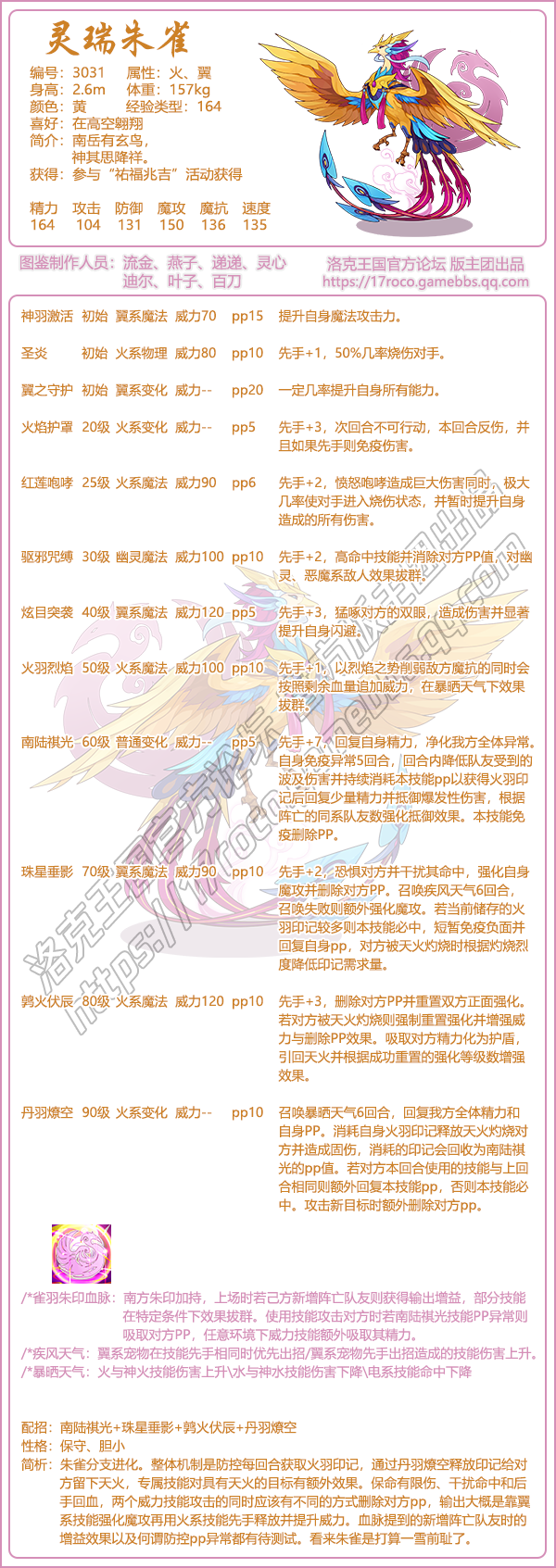 简析:朱雀分支进化。整体机制是防控每回合获取火羽印记,通过丹羽燎空释放印记给对方留下天火,专属技能对具有天火的目标有额外效果。保命有限伤、干扰命中和后手回血,两个威力技能攻击的同时应该有不同的方式删除对方pp,输出大概是靠翼系技能强化魔攻再用火系技能先手释放并提升威力。血脉提到的新增阵亡队友时的增益效果以及何谓防控pp异常都有待测试。看来朱雀是打算一雪前耻了。