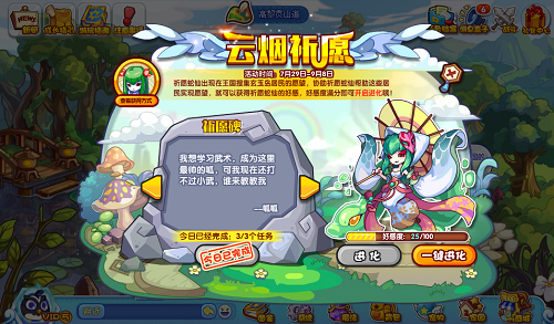 3、祈愿蛇仙活动!每天祈愿碑会刷新三个任务,每完成一个小任务可获得一定的好感度,累计100活动进度可获得祈愿蛇仙的进化资格,每天最多可完成3个小任务。