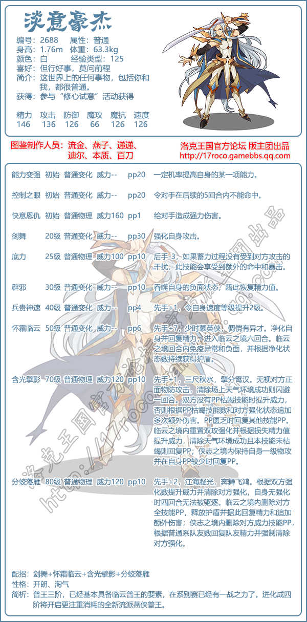 洛克王国游戏中淡意豪杰是一位物攻宠物,性格推荐加速减魔攻的开朗,或者加防减魔攻的淘气。淡意豪杰普王三阶,已经基本具备临云普王的要素,在系别赛已经有益战之力了。进化成四阶将开启更注重消耗的全新流派燕侠普王。