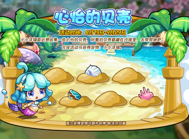 小小泽翊最近想收集一些心怡的贝壳,好看的贝壳都藏在沙堆里,去帮帮她吧。完成活动可获得宠物:小小泽翊。