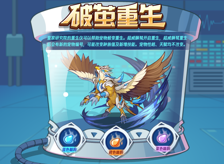 皇家研究院的重生仪可以帮助宠物蜕变重生。超威狮鹫开启重生,超威狮鹫重生后会有新的宠物编号,可能改变种族值及新增技能。宠物性格、天赋均不改变。
