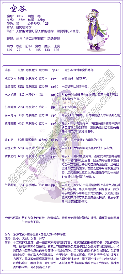 洛克王国游戏中空谷编号3087,是毒属性宠物,十二花神之兰花,是一位喜欢研究植物的学者。种族方面自身物防较低,其他种族尚可。下面易采游戏网小编就给大家带来了《洛克王国》空谷技能表图鉴,技能表种族值可以让大家快速了解这个宠物各项信息,感兴趣的速来围观吧!