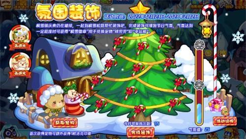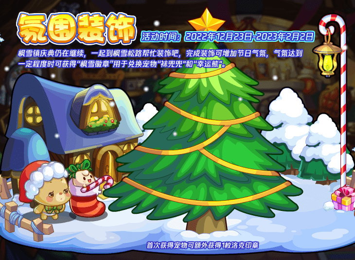 枫雪镇庆典仍在继续,一起到枫雪松路帮忙装饰吧,完成装饰可增加节日气氛,气氛达到一定程度时可获得“枫雪徽章”用于兑换宠物“袜兜兜”和“幸运熊”。