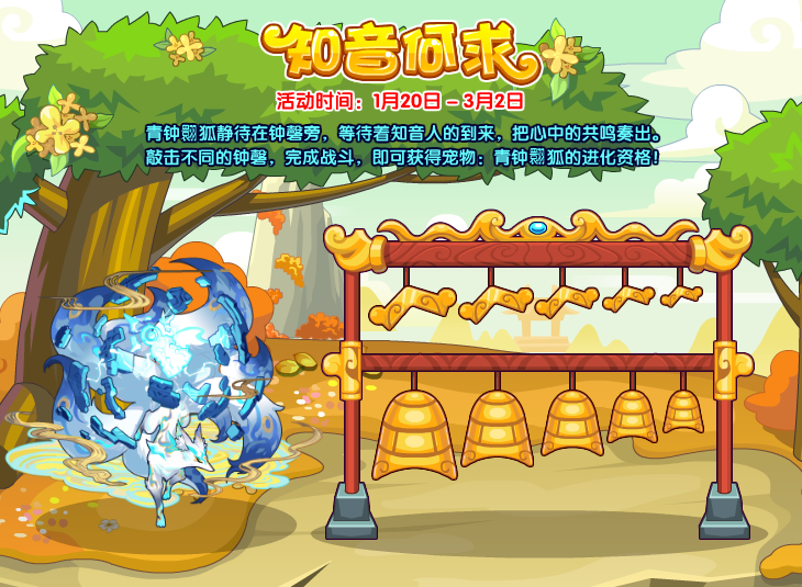 青钟翾狐静待在钟磬旁,等待着知音人的到来,把心中的共鸣奏出。敲击不同的钟磬,完成战斗,即可获得宠物:青钟翾狐的进化资格!