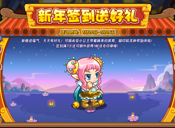 新春送福气,天天有好礼!可丽希亚小公主带着精美的家具,脚印和各种奖励来啦!签到满7次还可额外获得1枚洛克印章哦!