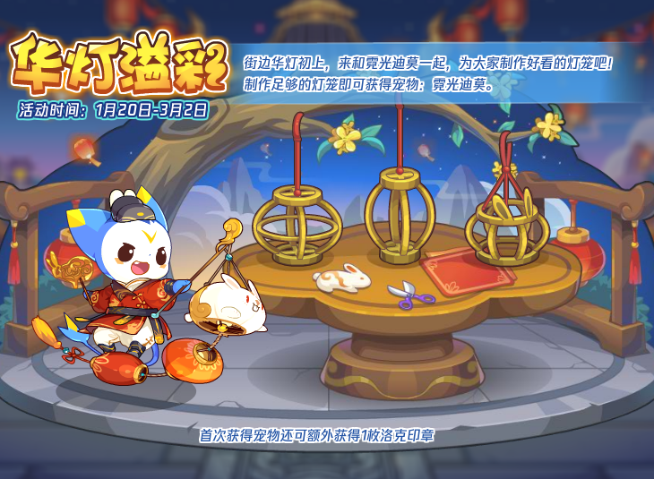 街边华灯初上,来和霓光迪莫一起,为大家制作好看的灯笼吧!制作足够的灯笼即可获得宠物:霓光迪莫。