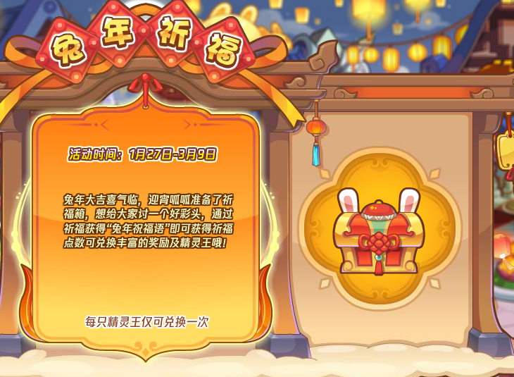 兔年大吉喜气临,迎宵呱呱准备了祈福箱,通过祈福获得“兔年祝福语”即可获得祈福点数用于兑换丰富的奖励和精灵王哦!