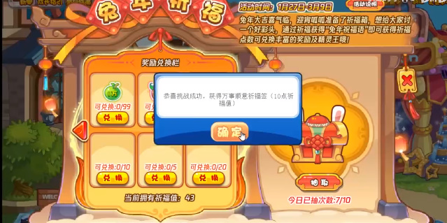 一天10次机会,满10次额外多送10点祈福值挑战成功概率获得兔年吉祥签,带有兔字可额外获得1次抽奖机会。