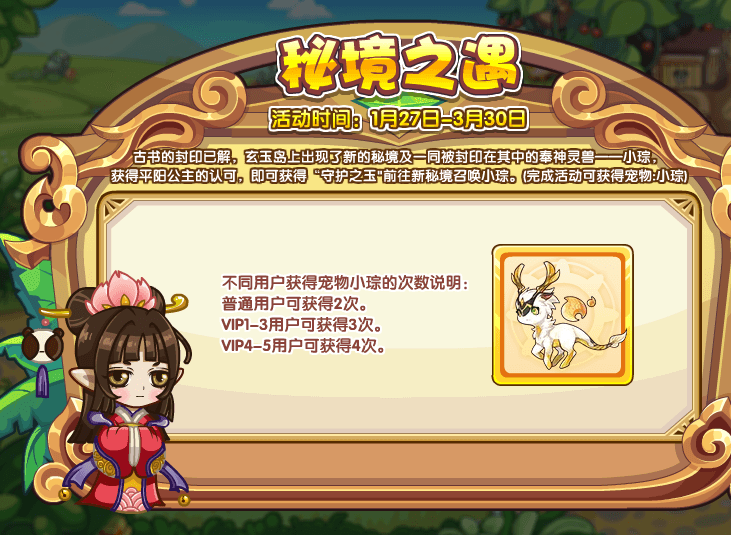 古书的封印已解,玄玉岛上出现了新的秘境及一同被封印在其中的奉神灵兽——小琮,获得平阳公主的认可,即可获得“守护之玉"前往新秘境召唤小琮。(完成活动可获得宠物:小琮)