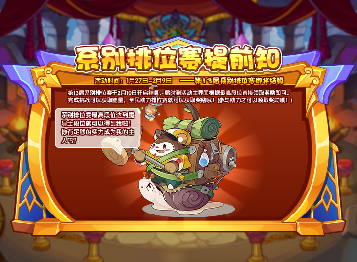 第13届系别排位赛于2月10日开启结算,届时到活动主界面根据最高段位直接领取奖励即可。完成挑战可以获取能量,全民助力排位赛就可以获取奖励哦!(参与助力才可以领取奖励哦!)