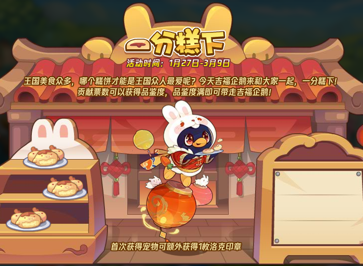 王国美食众多,哪个糕饼才能是王国众人最爱呢?今天吉福企鹅来和大家一起,一分糕下!贡献票数可以获得品鉴度,品鉴度满即可带走吉福企鹅!投票满五天,还可以额外获得定制名牌一枚!
