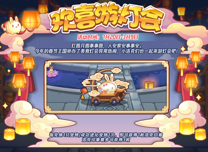 街边华灯初上,来和霓光迪莫一起,为大家制作好看的灯笼吧!制作足够的灯笼即可获得宠物:霓光迪莫。