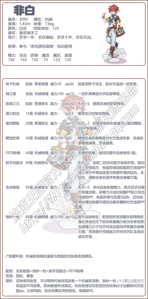洛克王国游戏中非白是代表杏花的花神系列宠物,属性是机械系,编号3093。下面易采游戏网小编就给大家带来了《洛克王国》非白技能表图鉴,技能表种族值可以让大家快速了解这个宠物各项信息,感兴趣的速来围观吧!