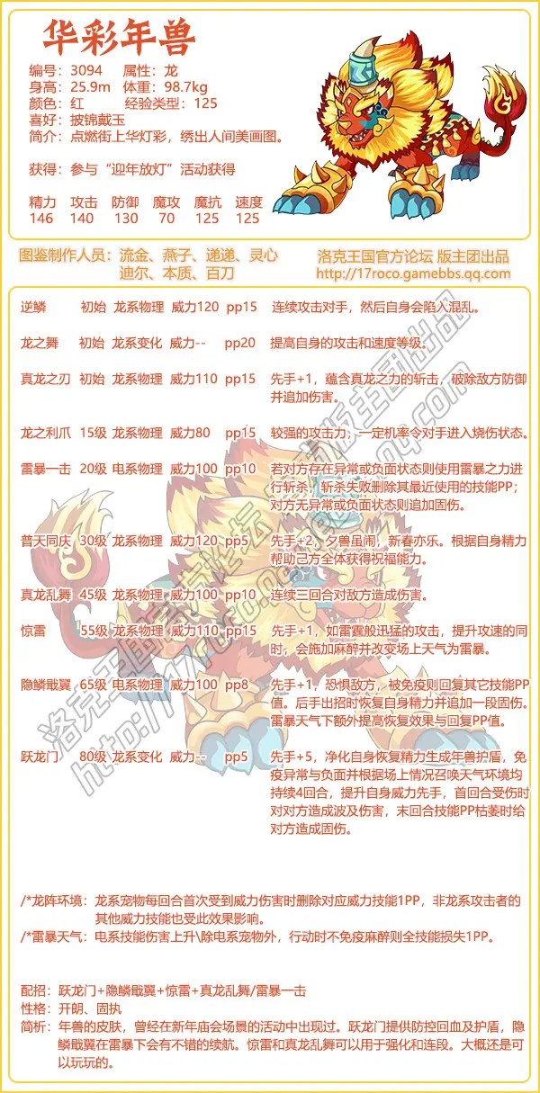洛克王国游戏中华彩年兽是编号3094,是兔年新的年兽皮肤!魔抗从111改成125,总和从722改成736,下面易采游戏网小编就给大家带来了《洛克王国》华彩年兽技能表图鉴,技能表种族值可以让大家快速了解这个宠物各项信息,感兴趣的速来围观吧!
