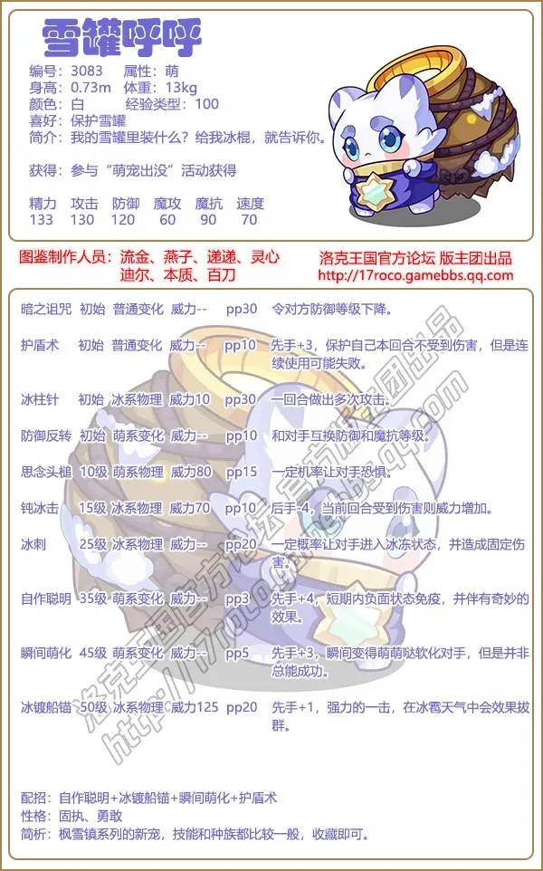 3、雪罐呼呼简析:枫雪镇系列的新宠,技能和种族都比较- -般, 收藏即可.