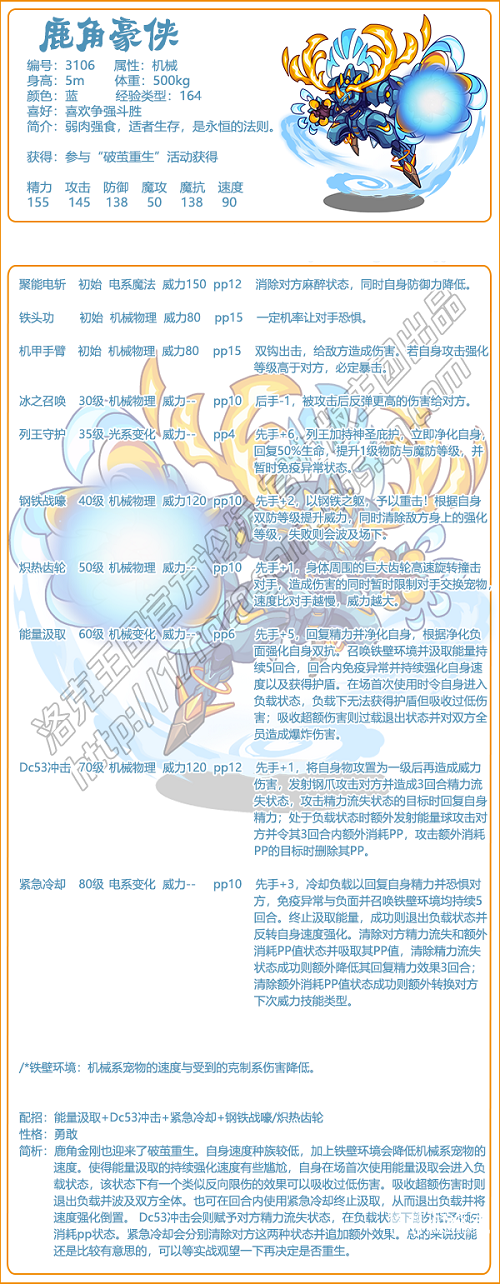 3、鹿角金刚也迎来了破茧重生,自身速度种族较低,加上铁壁环境会降低机械系宠物的速度。使得能量汲取的持续强化速度有些尴尬,自身在场首次使用能量汲取会进入负载状态,该状态下有一个类似反向限伤的效果可以吸收过低伤害。