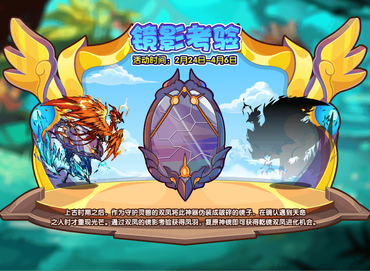 另外一边“奉神”系列在本周迎来了乾镜双凤,上古时期之后,作为守护使的双凤将此神器伪装成破碎的镜子,在确认遇到天命之人时才重现光芒。通过双凤的镜影考验获得凤羽,复原神镜即可获得乾镜双凤进化机会。记得去看看哦!