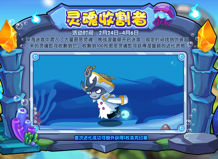 除此之外涅普顿也又一次与我们见面了,深海迷宫中混入了大量邪恶灵魂,挑战涅普顿开启迷宫,规定时间找到伪装起来的灵魂即可收割到它。收割到100枚邪恶灵魂即可获得涅普顿的进化资格。感兴趣的宝宝们别错过了哦!