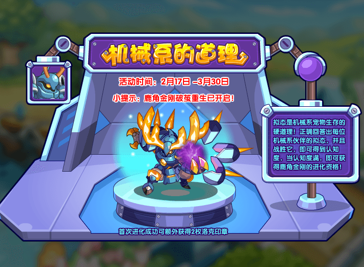 拟态是机械系宠物生存的硬道理!正确回答出每位机械系伙伴的拟态,并且战胜它,即可得到认知度,当认知度满,即可获得鹿角金刚的进化资格!