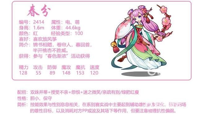 春分简析:技能效果与性别息息相关,在系别赛实战中主要起到辅助雌性队友强化、驱逐霸场的雄性目标,以及消耗对方PP或波及其场下等作用,但要注意物理抗性偏弱。