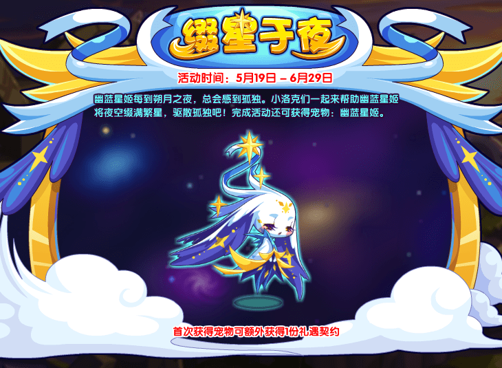 幽蓝星姬每到朔月之夜,总会感到孤独。小洛克们一起来帮助幽蓝星姬将夜空缀满繁星,驱散孤独吧!完成活动还可获得宠物:幽蓝星姬。