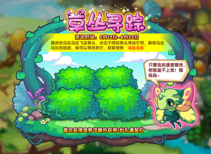 调皮的乌拉乌拉飞进草丛,点击不同的草丛寻找它吧,解锁乌拉乌拉的踪迹,就可以寻找到它,获取宠物“乌拉乌拉”。