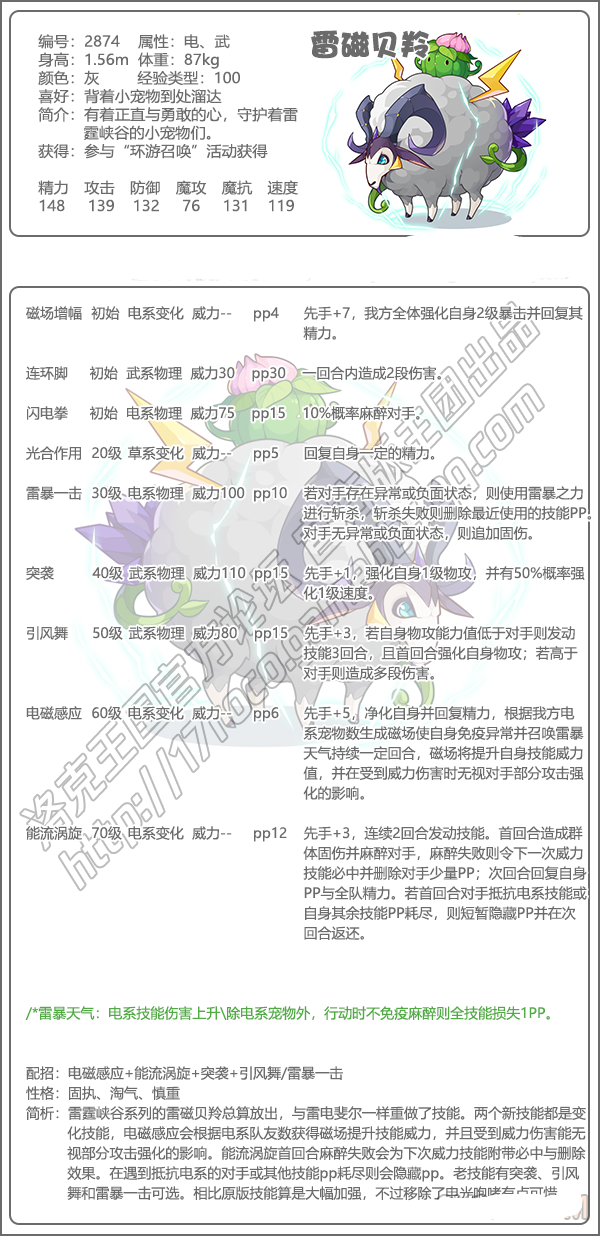 4、雷霆峽谷系列的雷磁贝羚总算放出,与雷电斐尔一样重做了技能。两个新技能都是变化技能,电磁感应会根据电系队友数获得磁场提升技能威力,并且受到威力伤害能无视部分攻击强化的影响。