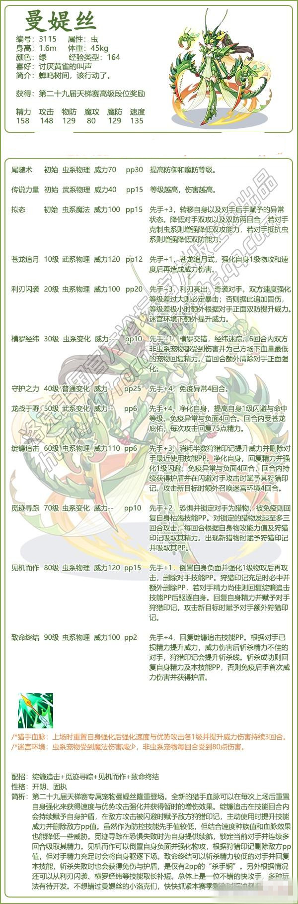 洛克王国游戏第29届天梯结算奖励---曼媞丝即将上线,这是一个编号3115的物攻宠物,总体上是一位不错的快攻手,多种玩法有待开发,下面是小编给大家带来的《洛克王国》曼媞丝技能表图鉴,技能表种族值可以让大家快速了解这个宠物各项信息,感兴趣的速来围观吧!