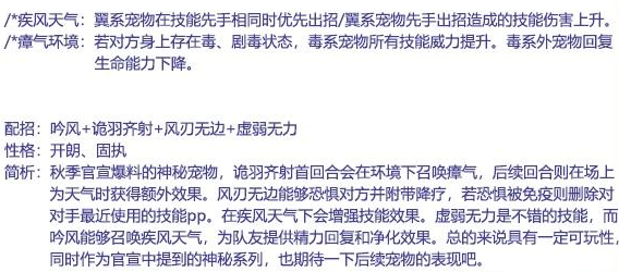 5.在疾风天气下会增理技能效果,虚弱无力是不错的技能,而吟风能够召唤疾风天气,为队友提供精力回复和净化效果。总的来说具有一定可玩性同时作为官宣中提到的神秘系列,也期待一下后续宠物的表现吧。