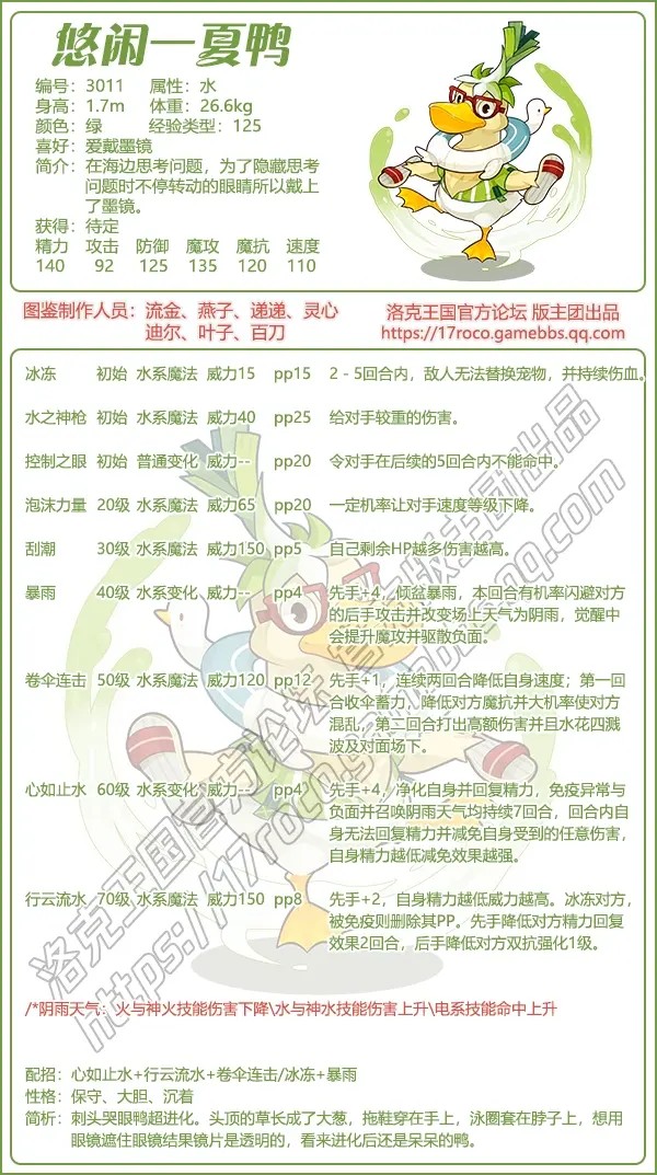 悠闲一夏鸭这个宠物是一个魔攻宠物,推荐性格保守、大胆、沉着等。