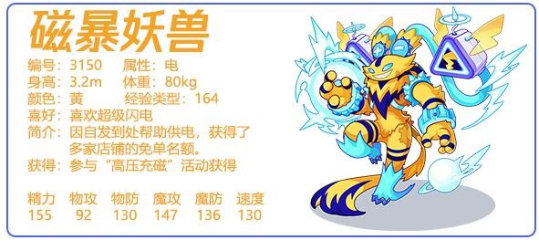 洛克王国磁暴妖兽是极电妖兽超进化,大家可以在高压充磁活动中获得该宠物,下面是小编给大家带来的《洛克王国》磁暴妖兽技能表图鉴,技能表种族值可以让大家快速了解这个宠物各项信息,感兴趣的速来围观吧!