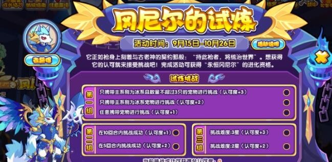 无论2星难度还是3星难度,冈尼尔只有血量的差别,技能均无防控,本次限制了冰系宠物进行试炼,上面已经推荐过宠物攻打,小洛克们可以根据自己的宠物进行选择和调整哦