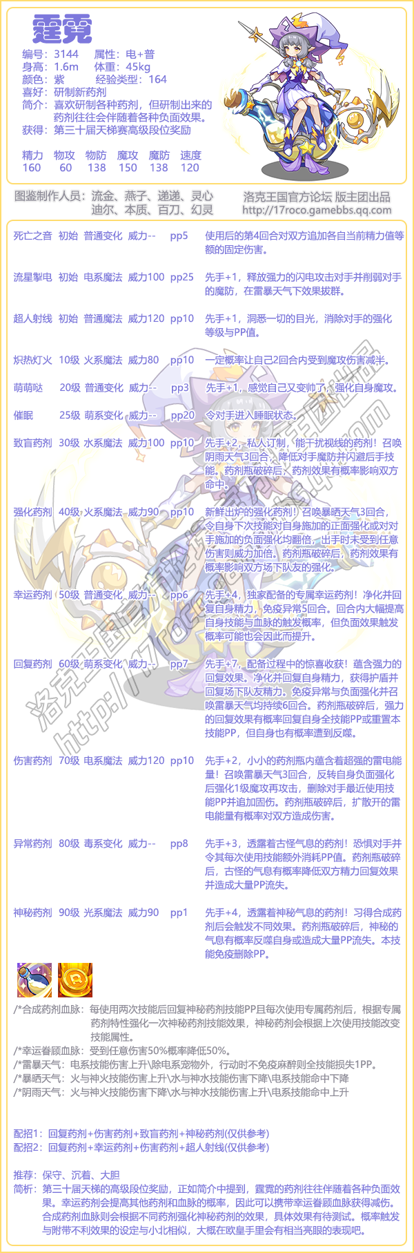 洛克王国霆霓是一个编号3144的魔攻宠物,霆霓技能配招1:回复药剂+伤害药剂+致盲药剂+神秘药剂。技能配招2:回复药剂+幸运药剂+伤害药剂+超人射线。还不清楚《洛克王国》霆霓技能搭配推荐的朋友速来围观吧,希望对大家有所帮助!