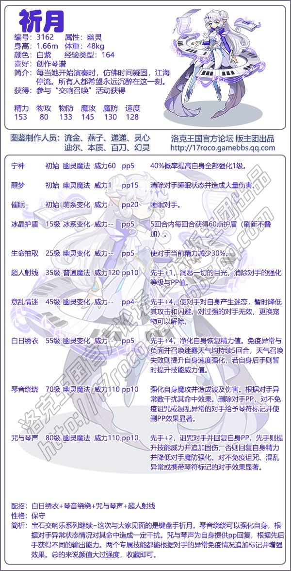 洛克王国祈月是编号3162的魔攻宠物,每当她开始演奏时,仿佛时间凝固,江海停流。所有人都希望永远沉醉在这一刻。下面是小编给大家带来的《洛克王国》祈月技能表图鉴,技能表种族值可以让大家快速了解这个宠物各项信息,感兴趣的速来围观吧!