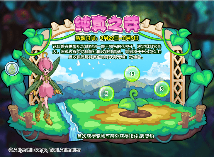 花仙兽在糖果纪念碑捡到一颗不知名的花种子,决定照料它长大。照料过程中花仙兽也能收获纯真值,等到种子开出花朵并且收集足够纯真值即可获得宠物:花仙兽。还可解锁“纯真徽章”哦!(玩家每拥有1个“数码核心”可每天额外获得1点体力。)