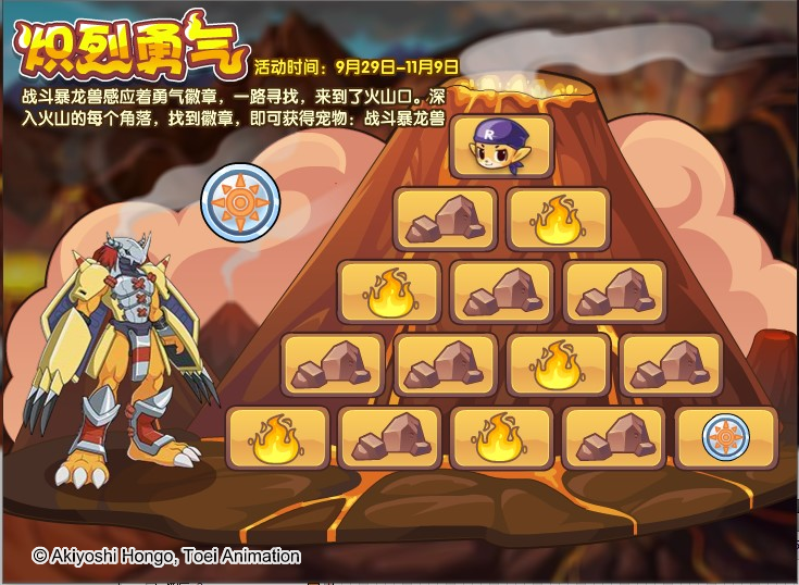 战斗暴龙兽感应着勇气徽章,一路寻找,来到了火山口。深入火山的每一个角落,找到徽章,即可获得宠物:战斗暴龙兽。(玩家每拥有1个“数码核心”可每日额外多探索1次)