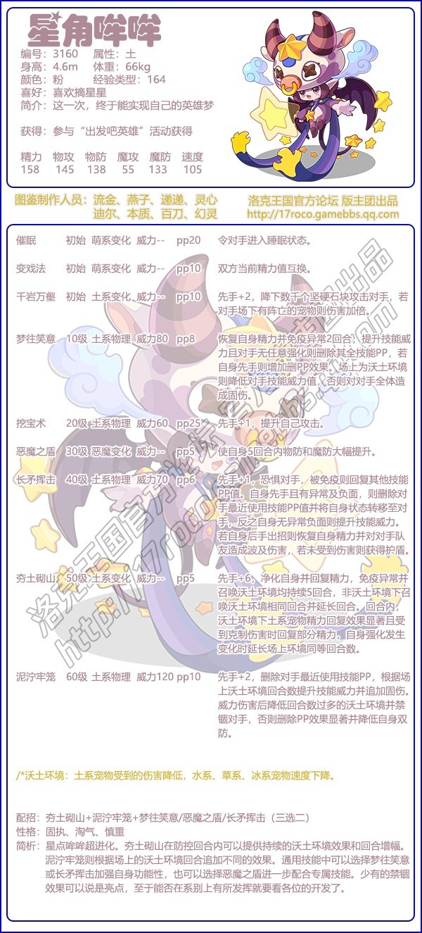 今日给大家带来了《洛克王国》星角哞哞性格技能搭配推荐分享,这是一个编号为3160的土属性的物攻宠物,参与出发吧英雄活动可获得。星角哞哞性格推荐:固执、淘气、慎重。技能配招:夯土砌山+泥泞牢笼+梦往笑意/恶魔之盾/长矛挥击(三选二)。